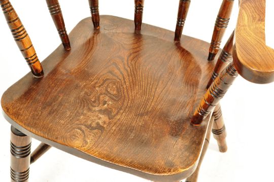 A late 19th Century Victorian beech and elm smokers bow chair / armchair having a spindle back with shaped arm rests and elm saddle seat raised on turned legs united by a single stretcher. Measures, 83cm x 69cm x 57cm.