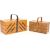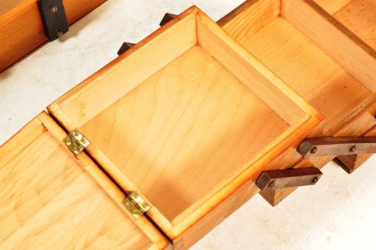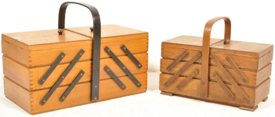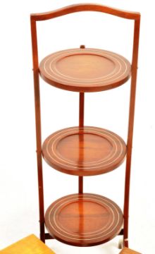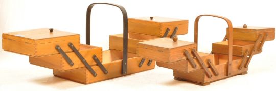 Two retro vintage 20th century circa 1970s teak sewing boxes. The sewing boxes having cantilever shelves with carry handle to the top. Together with a vintage 20th century inlaid metamorphic cake stand. Measures, 22cm x 43cm x 21cm.