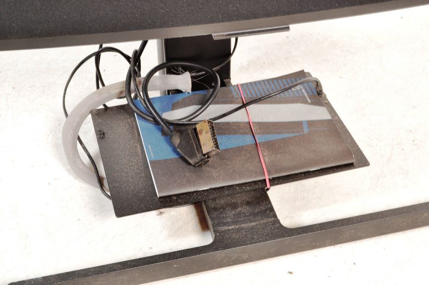 An early 21st century Bang & Olufsen Beovision MX8000 television / TV having a 25" screen with instruction manual and CD ROM raised on a stand. Produced between 2002 - 2005. Measures 97 x 64 x 47 cm.