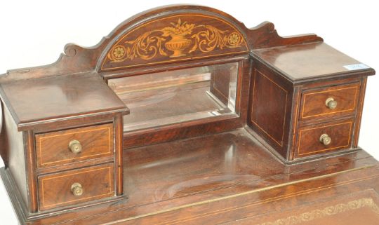 An early 20th century Edwardian circa 1910’s mahogany inlaid davenport being line inlaid with tooled leather desk top having hinged appointed interior with further hinged desk tidy cabinet above. Raised on shaped supports with a bank of drawers to the side.  Measures, 108cm x 59cm x 55cm.