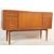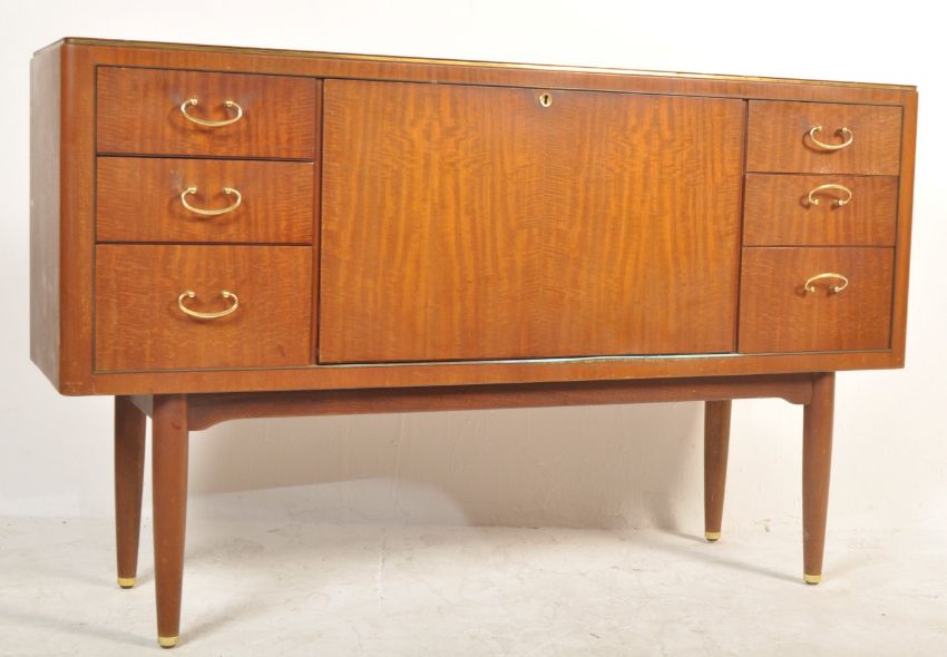 A vintage retro mid 20th century circa 1960's Danish inspired teak wood sideboard credenza having drop front drinks cupboard to the centre flanked by a bank of three graduated drawers to each side with brass swing handles raised on turned legs. Measures 89cm high x 45cm wide x 42cm depth.