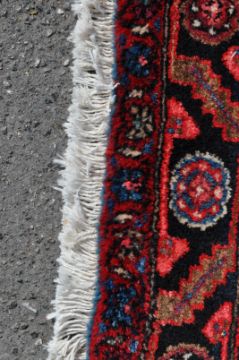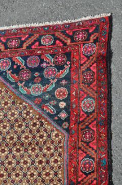 A 20th century Persian Islamic Koljai hand woven wool on cotton carpet rug being decorated with brown diamond motifs with red flower head motifs, dark blue corners with foliage motifs, blue main border decorated with red serpentine and floral motifs flanked by two red borders having blue pile directions and white fringe to rack end. Measures 247cm x 127cm.