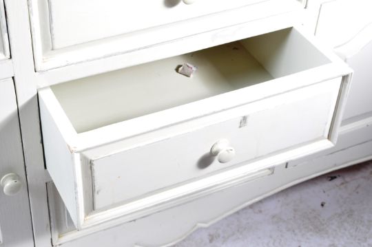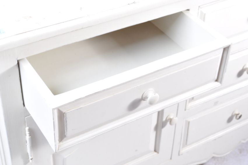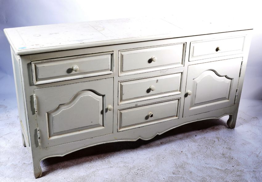 An early 20th century circa 1920’s shabby chic white painted sideboard. The sideboard of a rectangular form with shaped edges, back of three drawers to the centre flanked by single doors cupboards with drawer top, turned pull handles raised on shaped legs.