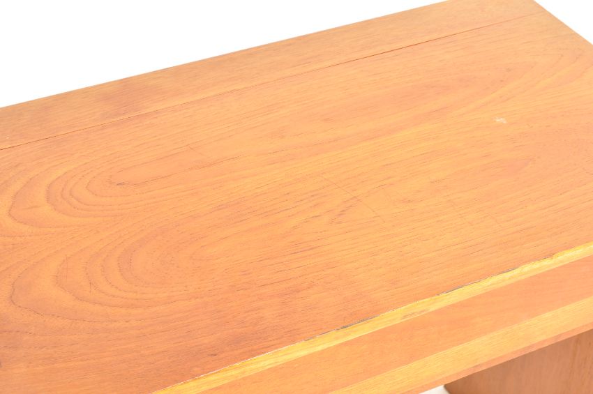 An original retro vintage 1970's teak wood dressing table having a lift up mirror top with white laminate interior. Long panel sides supporting the central desk / table. Measures 69 x 77 x 44 cm.