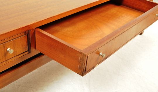 A retro vintage mid 20th Century coffee table of rectangular form with faux drawer fronts to the frieze raised on square legs. Measures 40 x 150 x 46 cm.