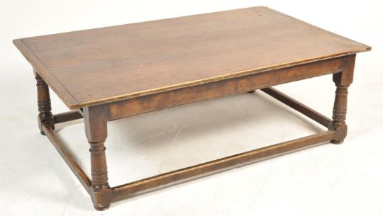 A 20th century oak low table of rectangular form in the 17th century style raised on turned legs united by stretchers. Measures 52cm x 153cm x 92cm.