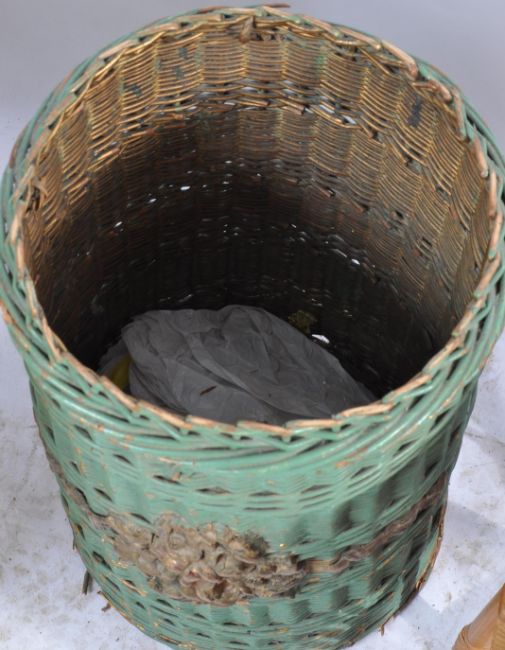 A group of vintage mid 20th century wicker items comprising of a Lloyd loom style laundry basket, a wicker basket together with a green and gilt painted wicker bin of cylindrical form. Largest measures 63cm x 48cm x 34cm.