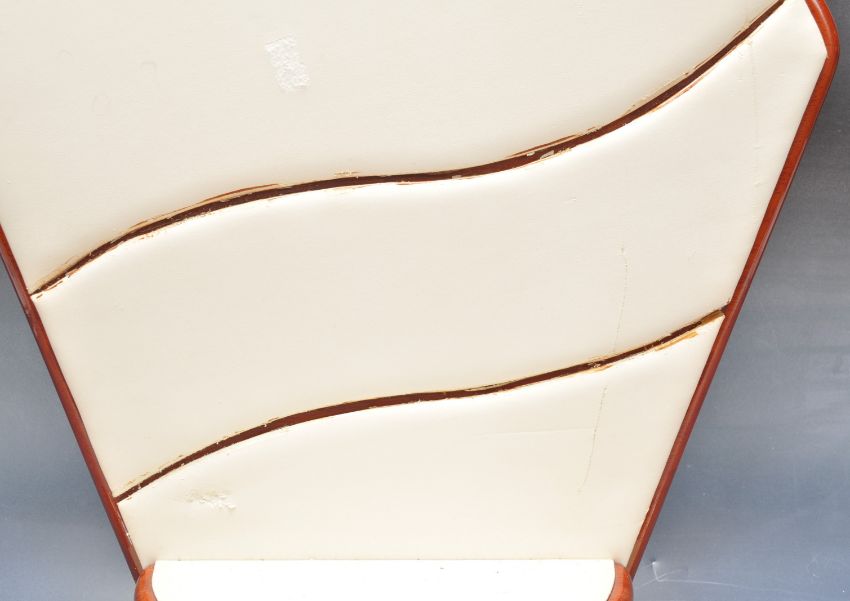 A vintage retro late 20th century 1950’s style jewellery stand. The stand having a fan style back with white faux leather panels raised on four step arched base with curved front. Measures 35cm x 50cm x 27cm.