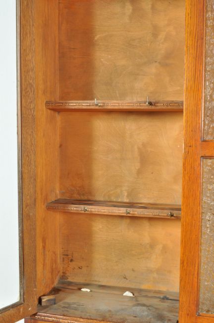 A 19th century Victorian circa 1880 oak stained glass and leaded glass dresser. The oak dressed having twin door glazed top with fixed shelves, stained lidded glass panel to the centre above a dresser base with drawers to the centre flanked by single door cupboard raised on turned legs. Measures, 215cm x 151cm x 46cm.