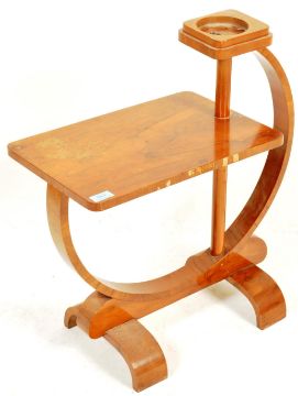 An original vintage 1930's Art Deco walnut smokers stand of circular form. The stand having a circle form body with inset ashtray raised on shaped base. Measures 65cm x 57cm x 30cm.