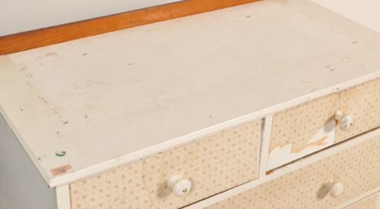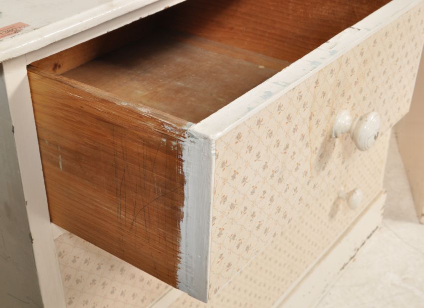 An Edwardian painted pine chest of drawer together with another. The white painted chests of a rectangular form with two over two drawers configuration raised on a plinth base. Measures 85cm high x 105cm wide x 53cm depth