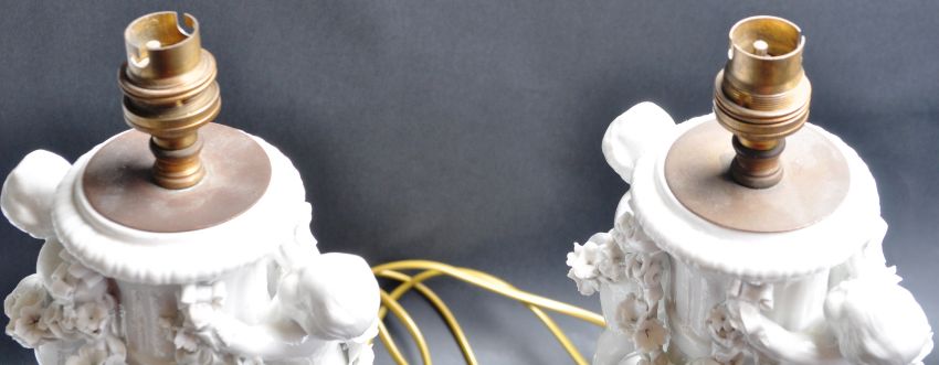 A pair of 20th Century Meissen / Dresden blanc de chine ceramic lamps in the form of vases with cherubs and encrusted florals raised on hexagonal bases. Crossed swords to the bases. Measures, 43 cm Tall