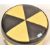 A retro vintage circa 1970s black and yellow leather footstool / pouffe of usual form having geometric decoration throughout. Measures 27cm x 40cm diameter.