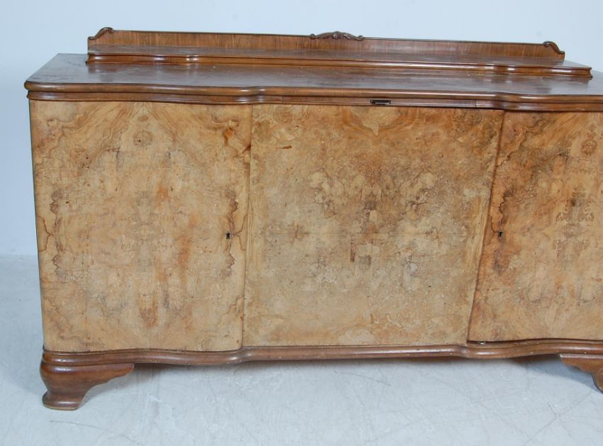 A 1930s 20th century French / Continental burr walnut veneer sideboard / credenza having a raised back over a central fall front cupboard flanked by single door cupboard opening to reveal a shelved interior raised on bracket feet.  94cm h x 183cm w x 60cm d