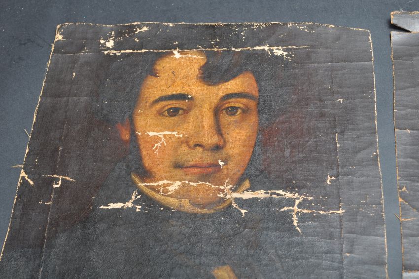 Two 18th century George IV oil on canvas portrait paintings. One picture depicting a young lady having a white bonnet and red mantua. The other painting depicting a young gentleman with dark coat and white scarf. No makers mark or any signature.