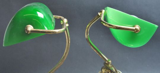 Two vintage 20th century bankers lamps having green glass shades raised on curved brass frames with circular base below. Largest measures 35cm high