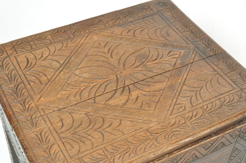 A 19th Century Victorian heavily carved oak storage box having a hinged lid with geometric patterns opening to reveal a spacious interior. Further carved decoration throughout with all being raised on straight legs. Measures, 46cm x 54cm x 46cm.