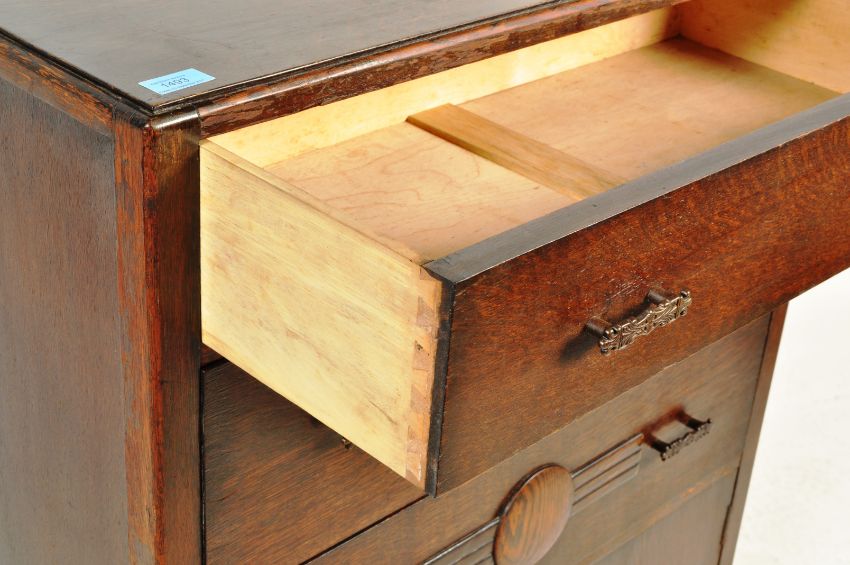 A vintage retro mid 20th century circa 1940’s war time dark oak tallboy. The tallboy having three graduated drawers atop over a twin door cupboard with original cast metal handles raised on square feet. Measures, 106cm x 75cm x 44cm.