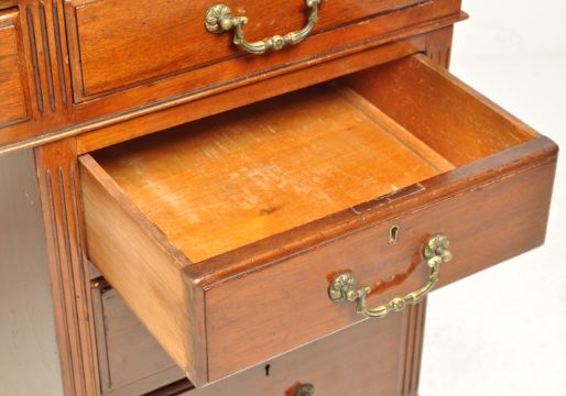 A Georgian Revival circa 1910 Edwardian mahogany pedestal desk having a gilt tooled leather skiver over a run of three drawers with swan handles raised on twin pedestals atop plinth bases. Measures 76cm x 151cm x 92cm.
