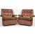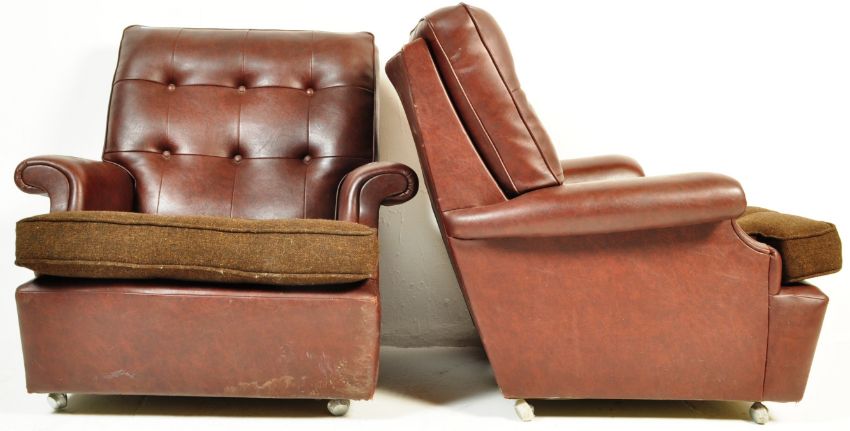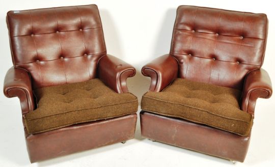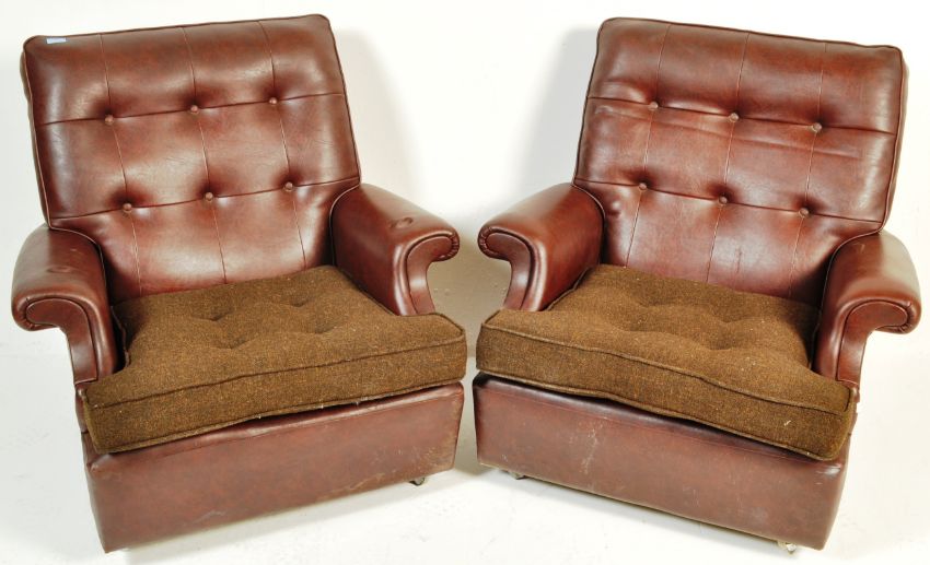 A pair of vintage retro mid 20th century circa 1970’s Parker Knoll armchairs / easy chairs. The chairs having brown leatherette upholstery, button backrest, barrel armrests, raised on casters. Measures, 85cm x 74cm x 77cm.