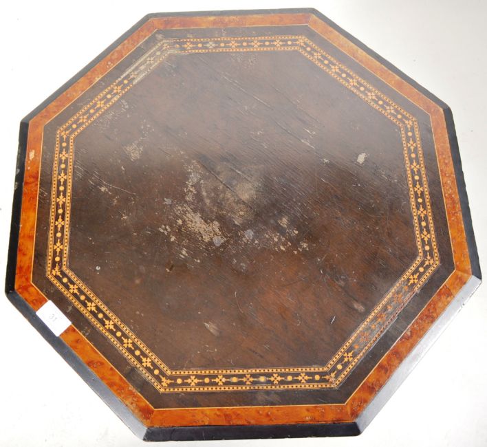 A 19th Century Victorian Aesthetic movement side occasional wine table in the manner of Gillows Of Lancaster having an octagonal table top with stencilled inlay detailing and burr walnut / amboyna wood panels with under tier gallery raised on turned quad baluster column over shaped 'X' base and legs. Measures approx; 63cm x 56cm x 56cm.