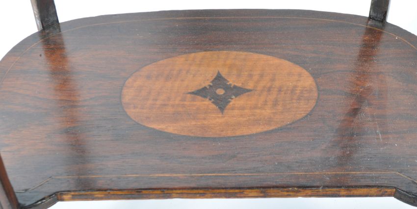 A 19th Century rosewood and inlaid marquetry two tier kidney shape side / occasional lamp table of decorative form. Stenciled inlaid decoration atop depicting a harvest bouquet with a further inlaid border. Flared top over a single drawer and lower second tier with patterned inlaid detailing. Raised on sweeping legs with carved paw feet. Measures approx 79cm x 64cm x 37cm.