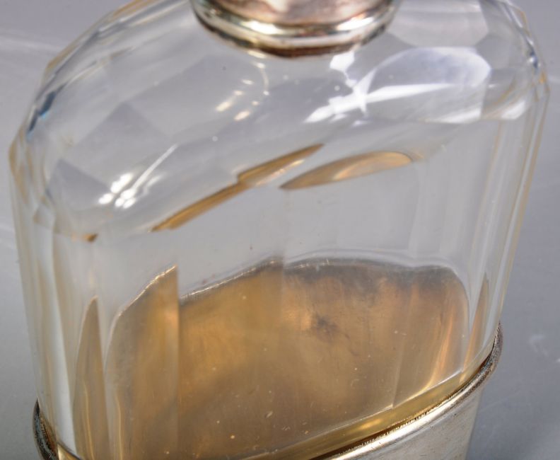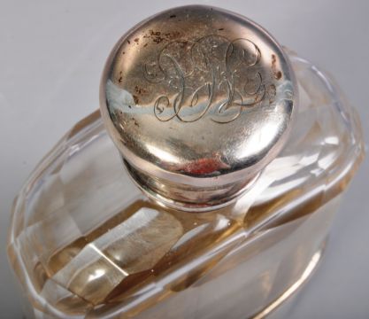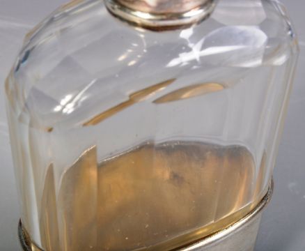A 19th Century Victorian hallmarked silver spirit flask decanter bottle having a twist off silver cap with segmented glass body and silver cup base. Engraved detailing to the base. Hallmarked for London 1885 makers Thomas Whitehouse / Thomas White. Measures approx; 14cm. No visible signs of major damage to the glass.