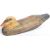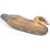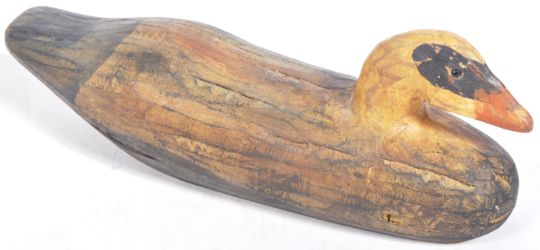 A Folk Art hand carved decoy duck. The decoy of thin elongated form being carved from a solid single piece of wood with hand painted detailing and inset eyes. Measures approx 13cm x 36cm x 10cm.