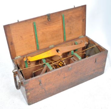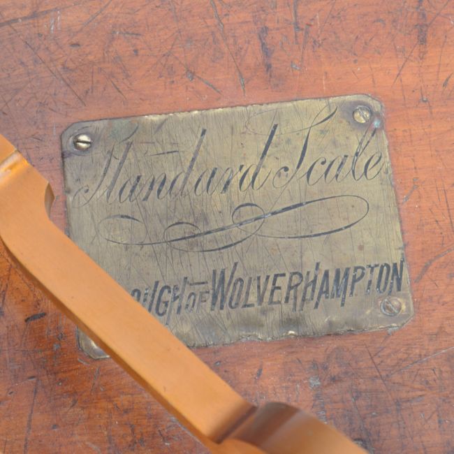 A set of 19th Century Victorian cased ' Standard Scale ' Avery hanging brass balance scales to weigh 56 lbs. Originally made for the Borough of Wolverhampton and likely the Dept of Weights & measures duty section. The beam scale also stamped for Borough of Wolverhampton. Cased within a large mahogany case with leather strap carry handles to side and plaque with notation to the top  marked for the Borough of Wolverhampton. Measures 36cm x 98cm x 41cm.