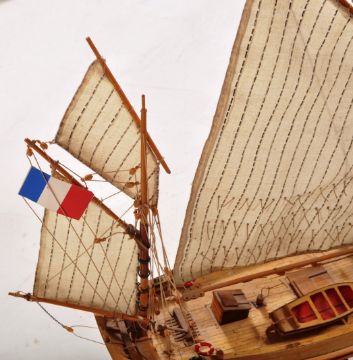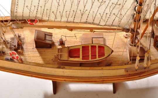 A 20th Century scratch built model boat. The double masted example with a series of sails and detailed deck having a lifeboat. Hand painted hull with all being raised upon a stand. Age related wear. Measures approx; 45cm x 51cm.