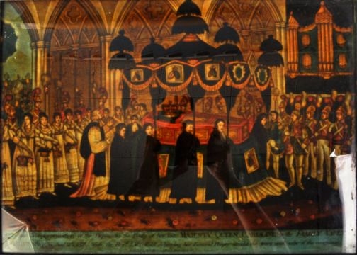An early 19th Century George III Regency Period reverse mezzotint on glass of vanitas / memento  mori theme. Entitled ' An Exact Representation of the Depositing the Body of her late MAJESTY QUEEN CAROLINE in the FAMILY VAULT BRUNSWICK Aug 24 1821. With the Reverend J.W.G. Wolff delivering her Funeral Prayer amidst the tears and sobs of the company ' Published by W.B Walker 4 Fox & Knot Court Cow Lane London. An unusual piece. Set to a period frame. Measures approx; 30cm x 40cm. No visible damage to the glass.