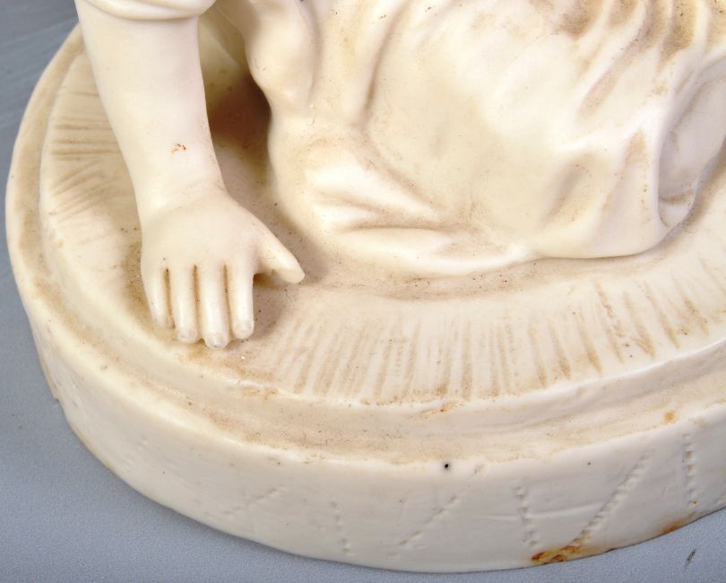 A 19th Century parian ware figure of young child looking distressed seated upon the ground holding a piece of paper dressed in robes. Raised upon an oval base with etched detailing. Wear commensurate with age, overall good. Measures approx; 13cm x 13cm x 10cm.