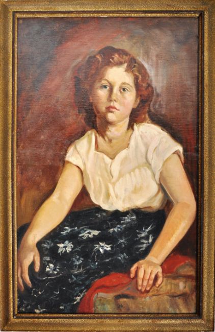 Winifred Bourne Medway (1882-1969) - Portrait Of Rosemary Brand - An oil on board portrait painting depicting a woman seated in white blouse with floral skirt. Set to a period frame.
