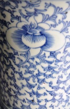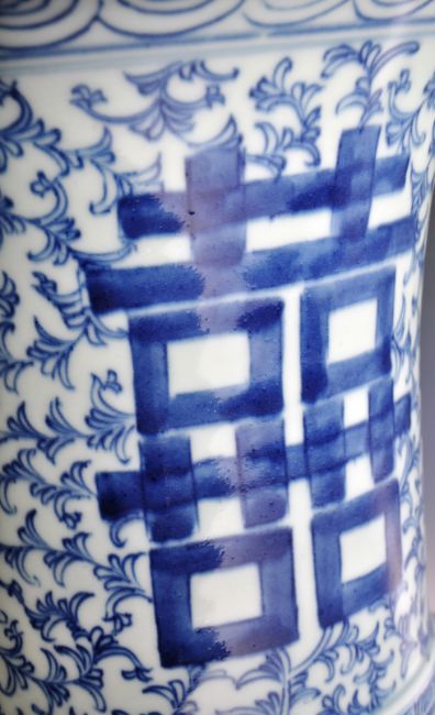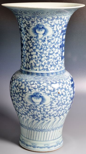 A large 19th Century Chinese QIng Dynasty porcelain baluster vase having hand painted blue and white decoration depicting repeating botanical patterns and large Happiness wedding favour symbols to the neck and body. Circular rim with waisted neck and baluster body. No visible damage. Measures approx; 40cm tall.