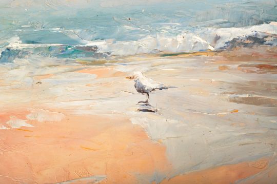 NIcholas St John Rosse b1945 - A 20th Century oil on board landscape painting entitled Bossiney Cove depicting three figures on a beach with gull bird resting on the sand, The blue sea with foaming waves crashing on the shore with cliffs and rocks. Signed to lower right corner. Set to a frame. Measures approx 23cm x 69cm. St Adwen Studio label to back with other related labels.