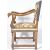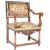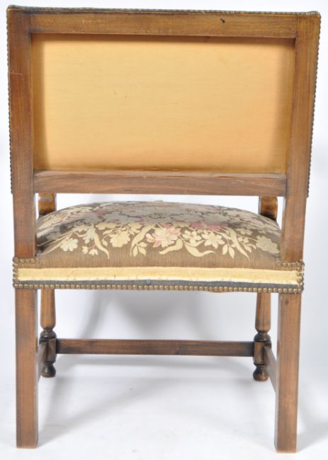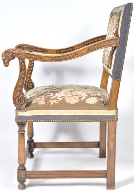A 20th Century walnut tapestry throne carver armchair in the manner of an 18th Century example. The chair having a single tapestry padded backrest with sweeping craved show wood arms having acanthus leaves and rams head ends. Tapestry upholstered seat rest decorated with urns, flowers and birds throughout with a carved cherub panel below. Raised on turned supports united by stretchers around. Measures approx; 93cm x 62cm x 61cm.