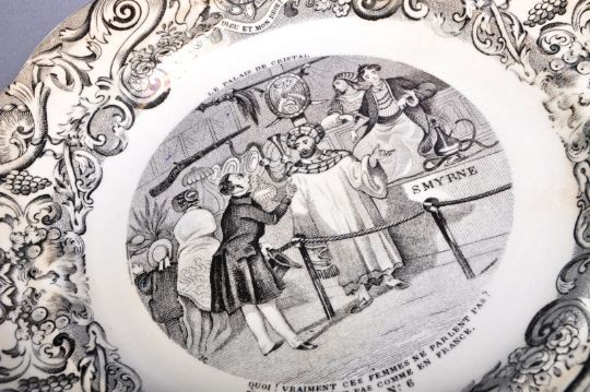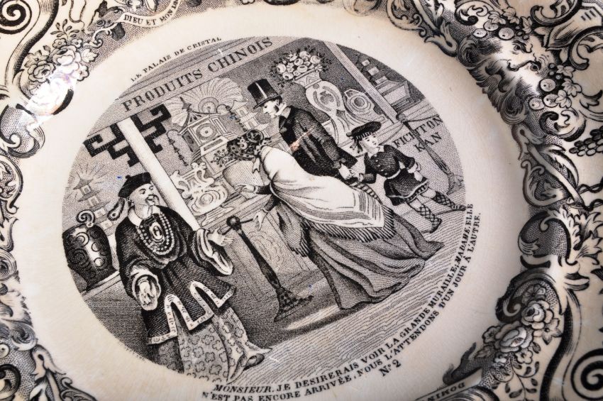 A matching set of ten late 19th Century French novelty Crystal Palace plates with each having scroll and floral patterned borders with central transfer printed street / shop scenes. French wording and crests with makers marks present for Geoffroy De Boulen & Gien. Wear commensurate with age throughout with chips mostly to the undersides. Each plate measures approx; 20cm diameter.