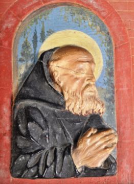 A believed 16th Century Renaissance plaster plaque depicting a religious scene carved in relief of a praying robed monk in front of a moonlit arch. Surrounded by a later gilt border and lacquered hardwood frame. Measures approx 25x17cm.