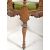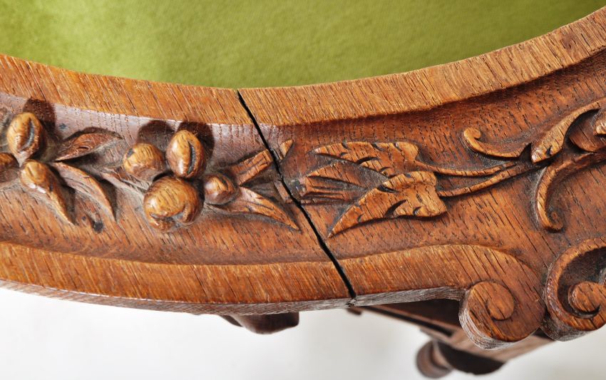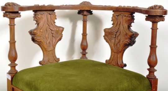 An Italianate 19th Century heavily carved walnut corner armchair having a decorative top rail carved with a central mask with floral and scroll detailing supported by three turned columns. Carved mythical creatures to the two back splats with padded green velvet seat rest below. Carved cherub face masks to the frieze below with all being raised on turned supports. Wear commensurate with age, overall good. Measures approx; 80cm x 73cm x 67cm.