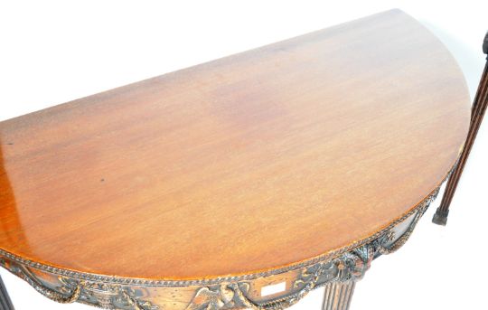An pair of Edwardian mahogany side tables / console tables in the manner of Robert Adam. The tables of demi lune shape with gadrooning to the edge. The frieze carved depicting eagles and rams head with ribbon and laurel leaf. Raised on tapered square columns with reeded details. Druce & Co of London plaque to the underside of one. Loss to part of the gallery decoration on one. Measures approx; 75cm x 114cm x 55cm.