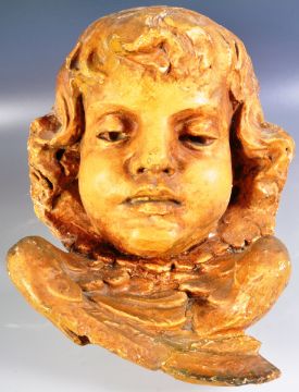 A 19th Century gilt plaster Reynolds cherub heads wall hanging mask with his wings coming from underneath. woven with horse hair for stability. Wear commensurate with age throughout. Measures approx; 35cm x 31cm.