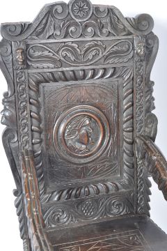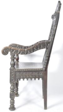 An 19th Century Victorian carved oak Wainscot chair throne armchair in the 17th Century manner having a carved scroll backrest with central cameo to the back, further carvings over a carved panel seat with carved block and turned legs united by a decorative carved stretcher. Measures approx; 128cm x 58cm x 43cm.