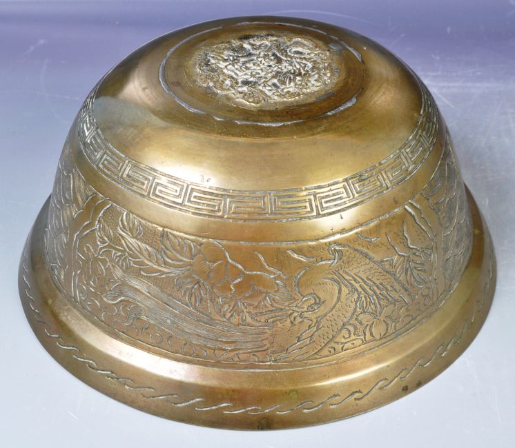 A 19th Century Chinese Xuande mark bronze censer bowl of large size having a flared rim with engraved detailing. The body decorated with scenes of dragons & phoenix with Greek key border to base. The underside having six character Xuande mark in Kaishu script. Measures approx; 12cm x 27cm. Weighs 1.878kg.