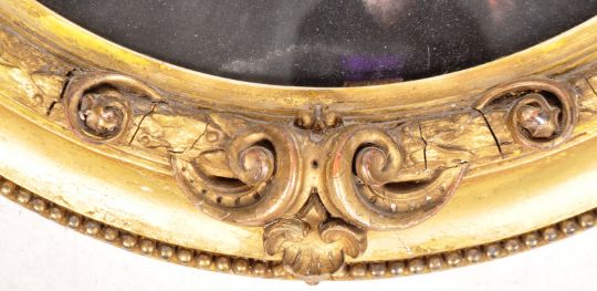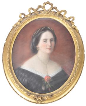 A 19th Century pastel portrait painting depicting Lady Katherine Blicke Archer. Set to a red ground with hair up, wearing a black and white lace ground holding a single red rose. Set to a glazed ornate gesso gilt painted frame with moulded details. Family tree and history notated to verso. Measures approx; 75cm x 56cm.
