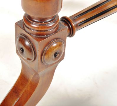 A 19th Century Victorian Aesthetic Movement walnut side occasional wine table in the manner of Gillows Of Lancaster having an octagonal table top with burr walnut veneer, ebony inlay and ebonised chamfered edge raised on turned quad baluster column over shaped 'X' base and legs with brown ceramic castors. Measures approx; 63cm x 56cm x 56cm.