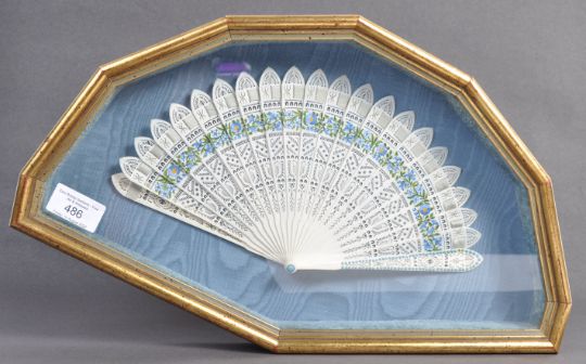 A 19th Century Chinese hand carved bone fan having 22 elegant panels with hand painted floral decoration and inset turquoise beads. Set to a gilded glass panelled fan case. Measures: 41cm x 25cm.