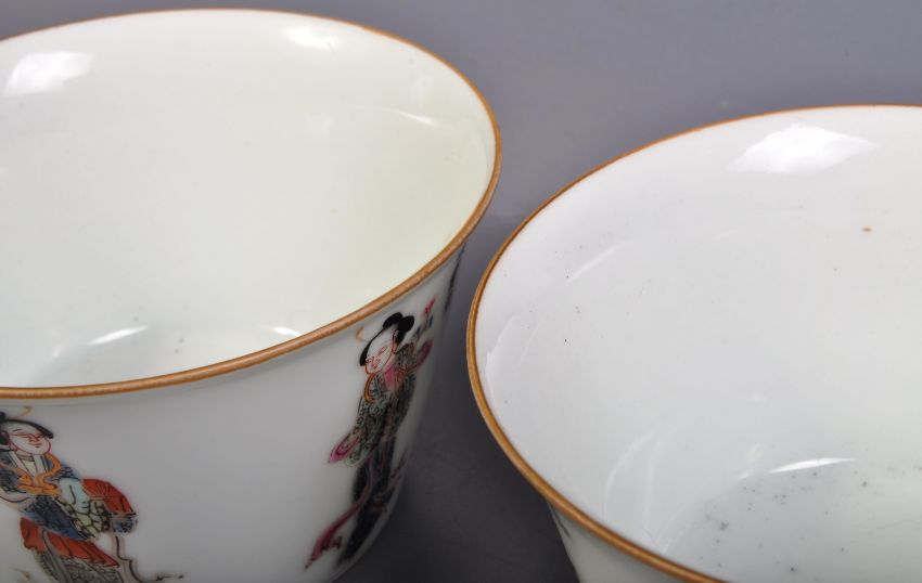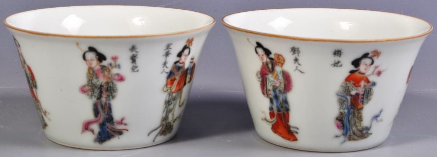 A pair of 19th Century Chinese Daoguang mark and period tea bowls / prayer bowls having hand painted polychrome enamel decoration depicting figures / Courtesans. Each figure named. Gilded rim to top. The underside bearing a six character Daoguang (1821-1850) reign mark in iron red Zhangshu seal script. Each bowl measures approx; 5cm x 9cm.