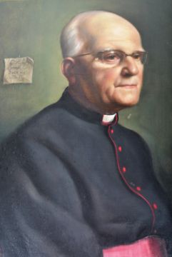 A 20th Century oil on canvas study portrait painting depicting Roman Catholic Monsignor Joseph C. Buckley J.C.B V.G. The painting showing the bishop facing left with a dark green toned background. Set within a decorative gilt frame. Unsigned. Measures approx; 85cm x 75cm.