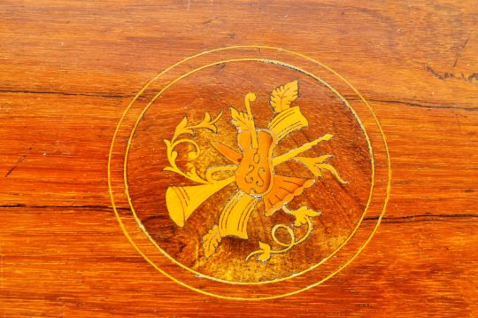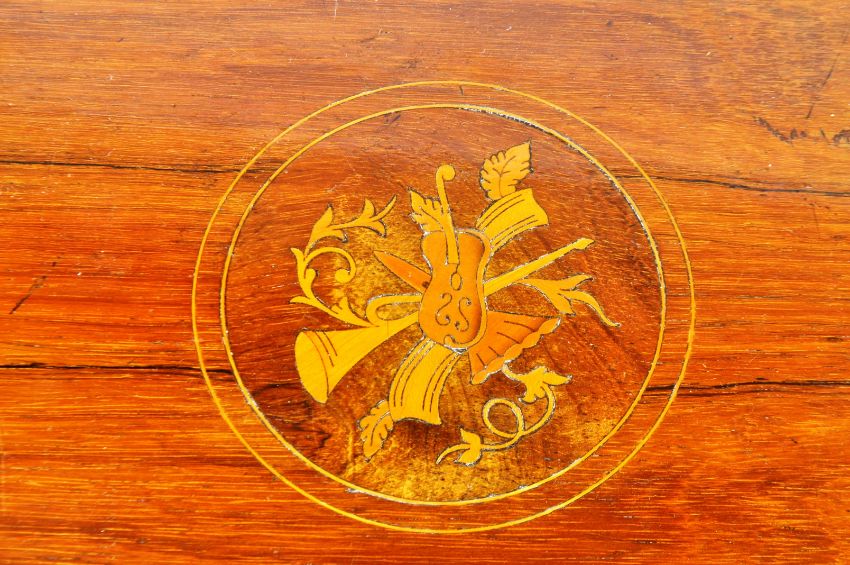 A 19th Century late Victorian mahogany and inlaid centre table of hexagonal form having a chamfered edge top with decorative musical instrument inland decoration. Further inlaid bands throughout with all being raised on sweeping supports united by a lower tier with all upon brown ceramic castors. Measures approx; 74cm x 73cm diameter. Overall good condition.