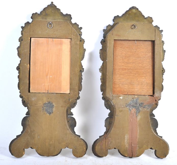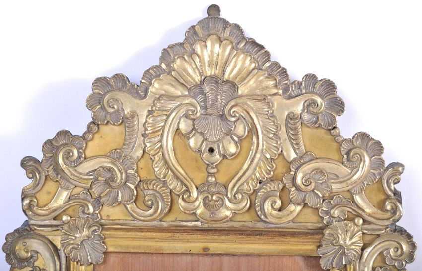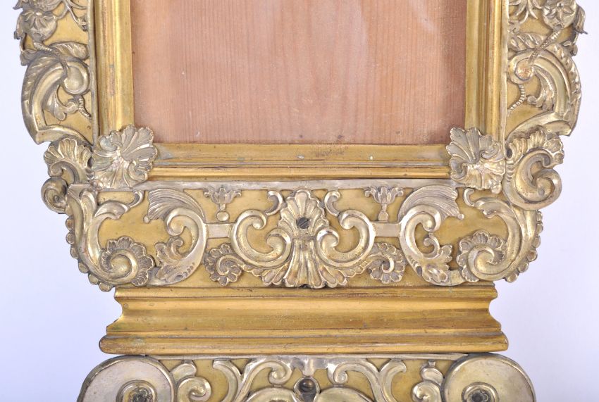 A pair of 18th Century repousse brass picture frames of Rococo form having square picture frames adorned with scrolls and shell motifs. Measures: 60cm x 31cm.